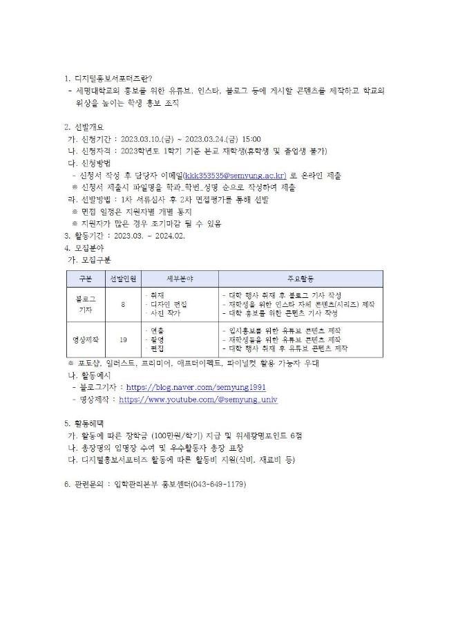 본문 시작 홈으로 커뮤니티 학과소개 입학정보 교수소개 학과과정 커뮤니티 공연예매 안내 홈페이지가이드 포토갤러리 공지사항 포토갤러리 작품DB 동아리 학사일정 학생회 포토갤러리 페이스북 트위터 프린트 2023학년도 세명대학교 디지털 홍보 서포터즈 연기예술학과 2446 2023-03-14 2023학년도 세명대학교 디지털 홍보 서포터즈 목록 이전2023학년도 1학기 개강총회 안내문 다음 2023학년도 학생위원회 신규위원 모집 담당부서 : 연기예술학과 담당자 : - 연락처 : 043-649-1733 최종수정일 : 2024-10-26 만족도조사 만족도 조사 이 페이지에서 제공하는 정보에 대하여 만족하시나요? 매우만족 만족 보통 불만족 매우불만족