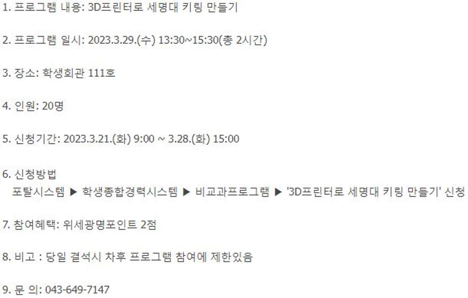 본문 시작 홈으로 커뮤니티 학과소개 입학정보 교수소개 학과과정 커뮤니티 공연예매 안내 홈페이지가이드 포토갤러리 공지사항 포토갤러리 작품DB 동아리 학사일정 학생회 포토갤러리 페이스북 트위터 프린트 3D 프린터로 세명대 키링 만들기 연기예술학과 2483 2023-03-20 3D 프린터로 세명대 키링 만들기 목록 이전2023학년도 1학기 FUN러닝프렌즈 다음 극단 각인각색 인큐베이팅 공연 - 3/4 (사분의 삼) 공연 성료 담당부서 : 연기예술학과 담당자 : - 연락처 : 043-649-1733 최종수정일 : 2024-10-26 만족도조사 만족도 조사 이 페이지에서 제공하는 정보에 대하여 만족하시나요? 매우만족 만족 보통 불만족 매우불만족