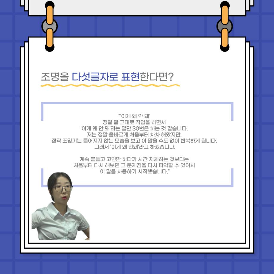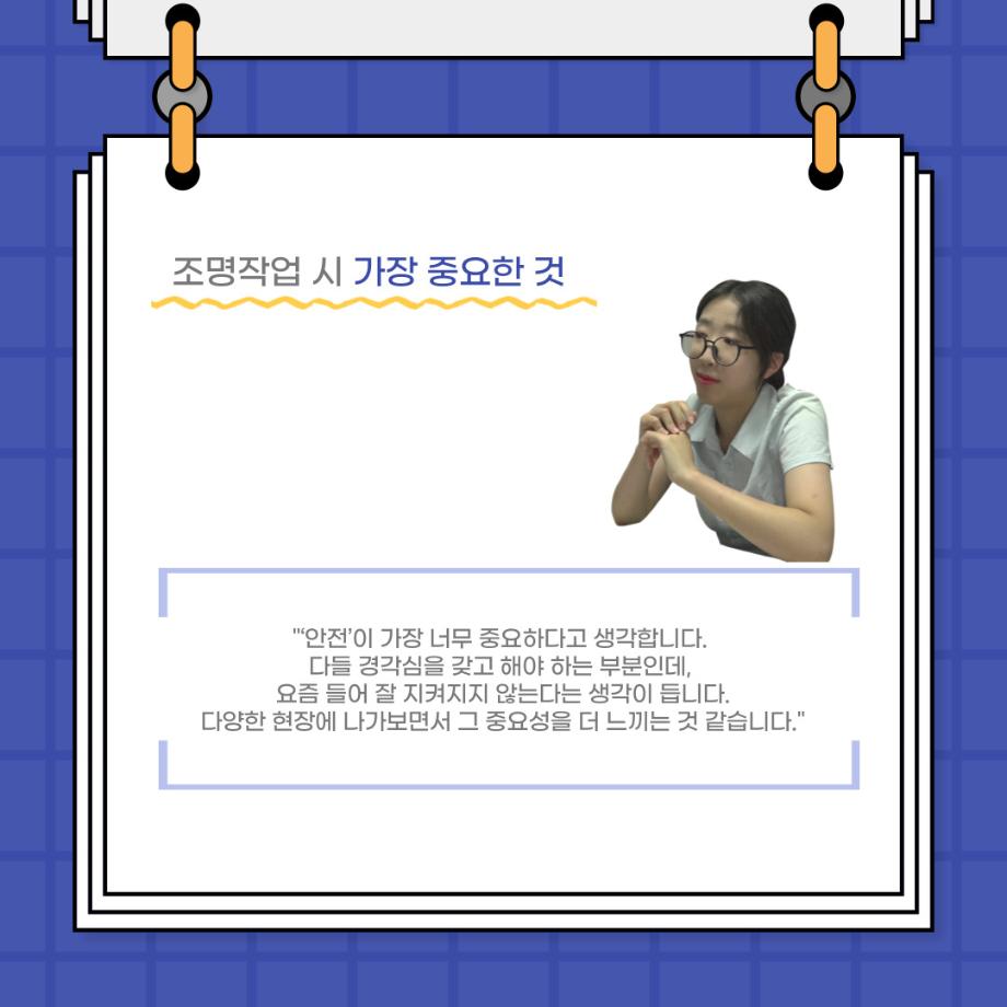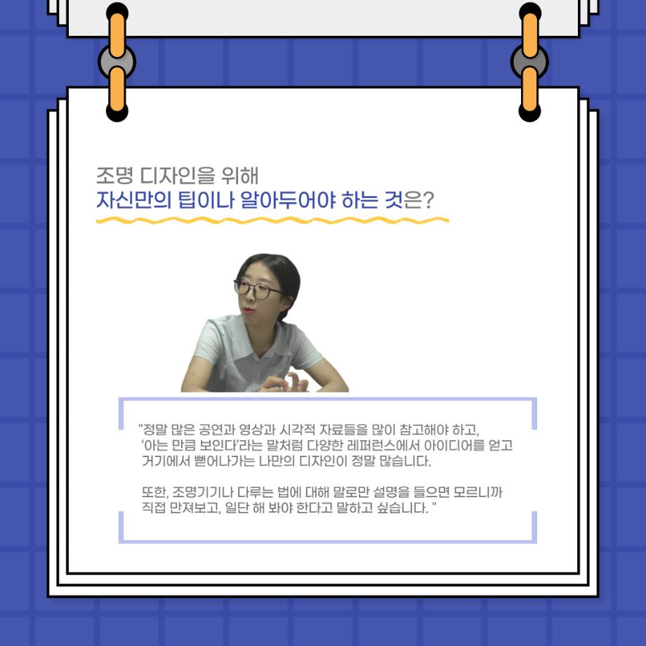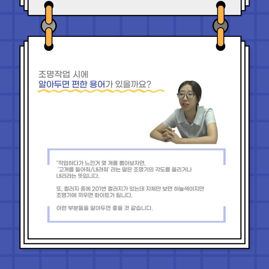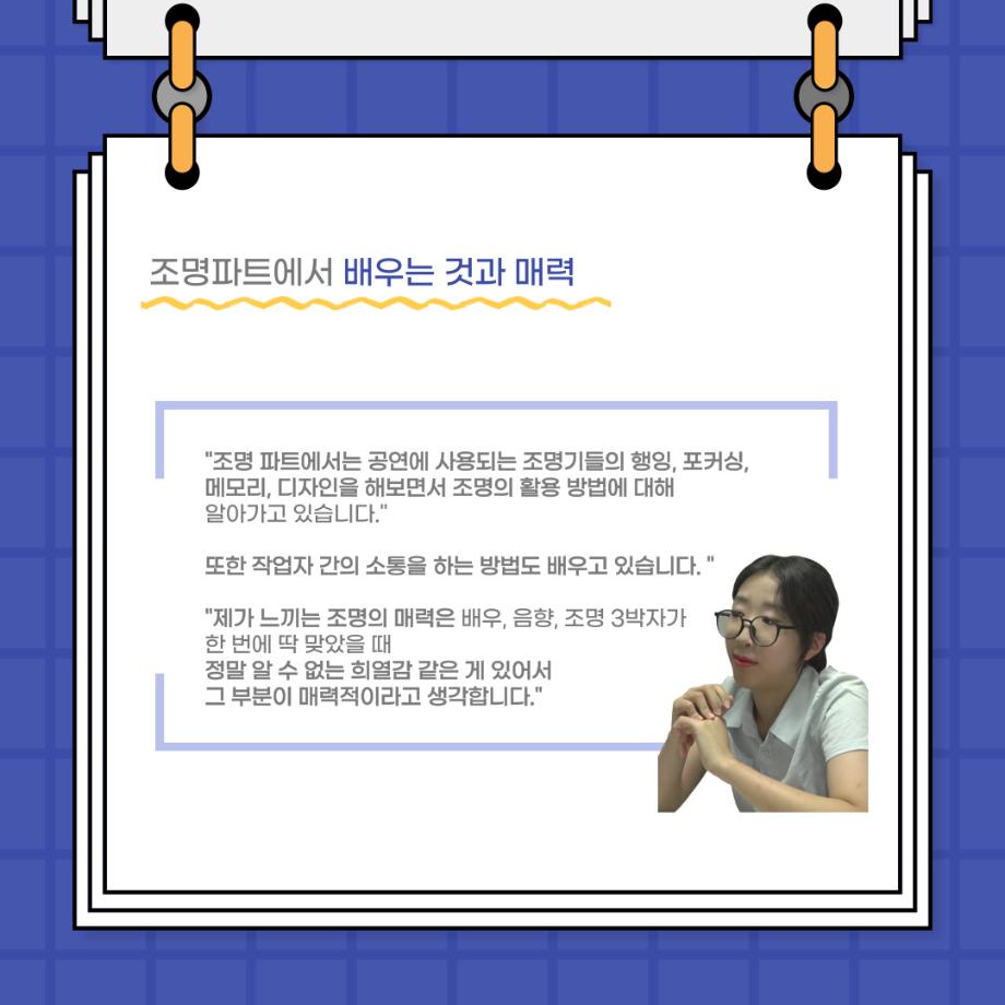 본문 시작 홈으로 커뮤니티 학과소개 입학정보 교수소개 학과과정 커뮤니티 공연예매 안내 홈페이지가이드 포토갤러리 공지사항 포토갤러리 작품DB 동아리 학사일정 학생회 포토갤러리 페이스북 트위터 프린트 사이와의 인터뷰 - 23년도 조명장 ‘김은경‘ 연기예술학과 3211 2023-07-10 안녕하십니까. 23년도 학회 ‘사이’입니다. 학회 ‘사이’의 두번째 인터뷰로 연기예술학과 23년도 조명장인 김은경 학생과 인터뷰하는 시간을 가졌습니다. 이번 인터뷰에서는 조명에 대한 매력과 조명 작업에서 가장 중요한 것, 조명 작업에서 알아두어야 하는 것 등에 대해 인터뷰하였습니다. 다음 인터뷰 컨텐츠 ‘사인’도 많은 사랑 부탁드립니다. 목록 이전2023학년도「전과자문단」운영 안내 다음 이지은 교수님 연출작품 <1923년생 조선인 최영우> 담당부서 : 연기예술학과 담당자 : - 연락처 : 043-649-1733 최종수정일 : 2024-10-26 만족도조사 만족도 조사 이 페이지에서 제공하는 정보에 대하여 만족하시나요? 매우만족 만족 보통 불만족 매우불만족