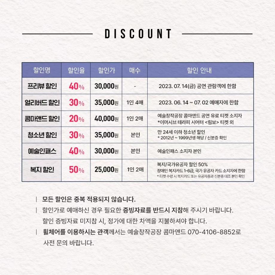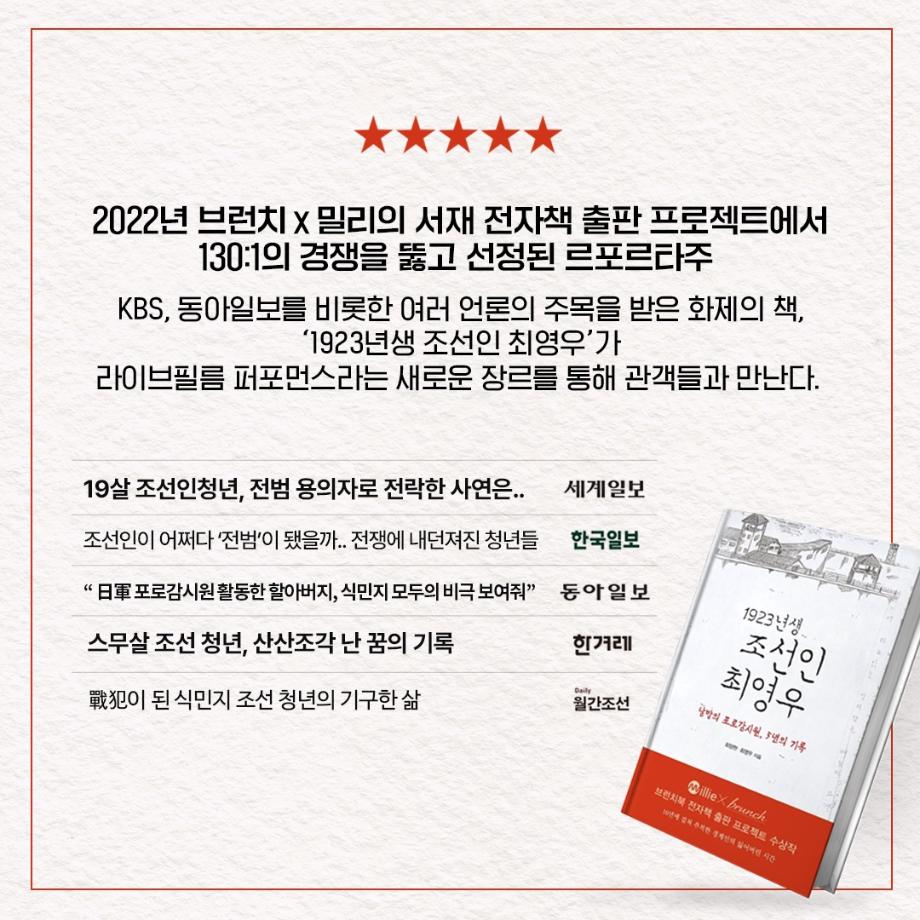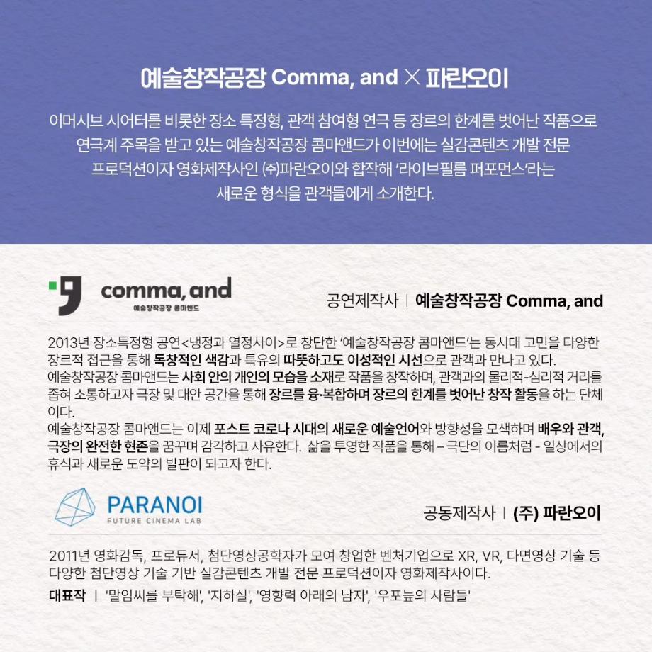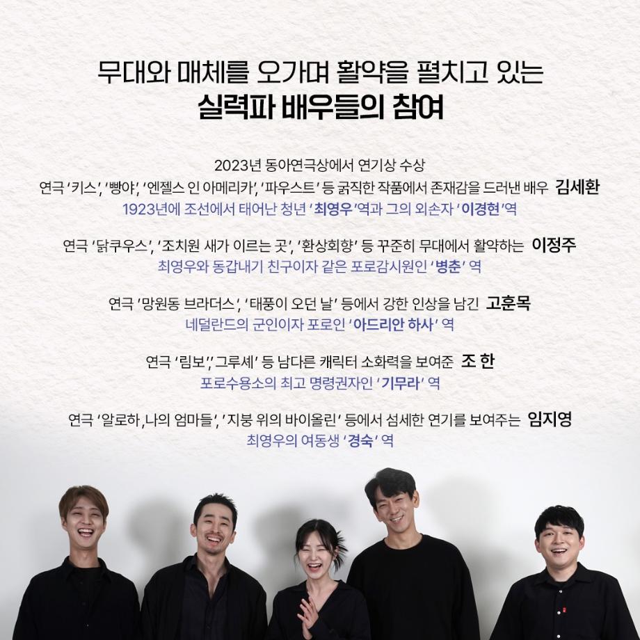 본문 시작 홈으로 커뮤니티 학과소개 입학정보 교수소개 학과과정 커뮤니티 공연예매 안내 홈페이지가이드 포토갤러리 공지사항 포토갤러리 작품DB 동아리 학사일정 학생회 포토갤러리 페이스북 트위터 프린트 이지은 교수님 연출작품 <1923년생 조선인 최영우> 연기예술학과 3262 2023-07-11 이지은(이태린) 교수님이 연출하신 <1923년생 조선인 최영우>가 2023년 한국문화예술위원회 예술과 기술융합 지원사업에 선정되어 이번에 공연을 올립니다. 2023.07.14. - 07.16 금 20:00 / 토 15:00, 19:00 / 일 15:00 동국대 이해랑예술극장 출연 : 김세환, 이정주, 고훈목, 조한, 임지영 극작 : 최양현 / 연출 : 이태린 주최/주관 예술창작공장 콤마앤드 @commaand2013 많은 관심 부탁드립니다. 목록 이전사이와의 인터뷰 - 23년도 조명장 ‘김은경‘ 다음 2023학년도 2학기 표준현장실습 학생신청 안내 담당부서 : 연기예술학과 담당자 : - 연락처 : 043-649-1733 최종수정일 : 2024-10-26 만족도조사 만족도 조사 이 페이지에서 제공하는 정보에 대하여 만족하시나요? 매우만족 만족 보통 불만족 매우불만족