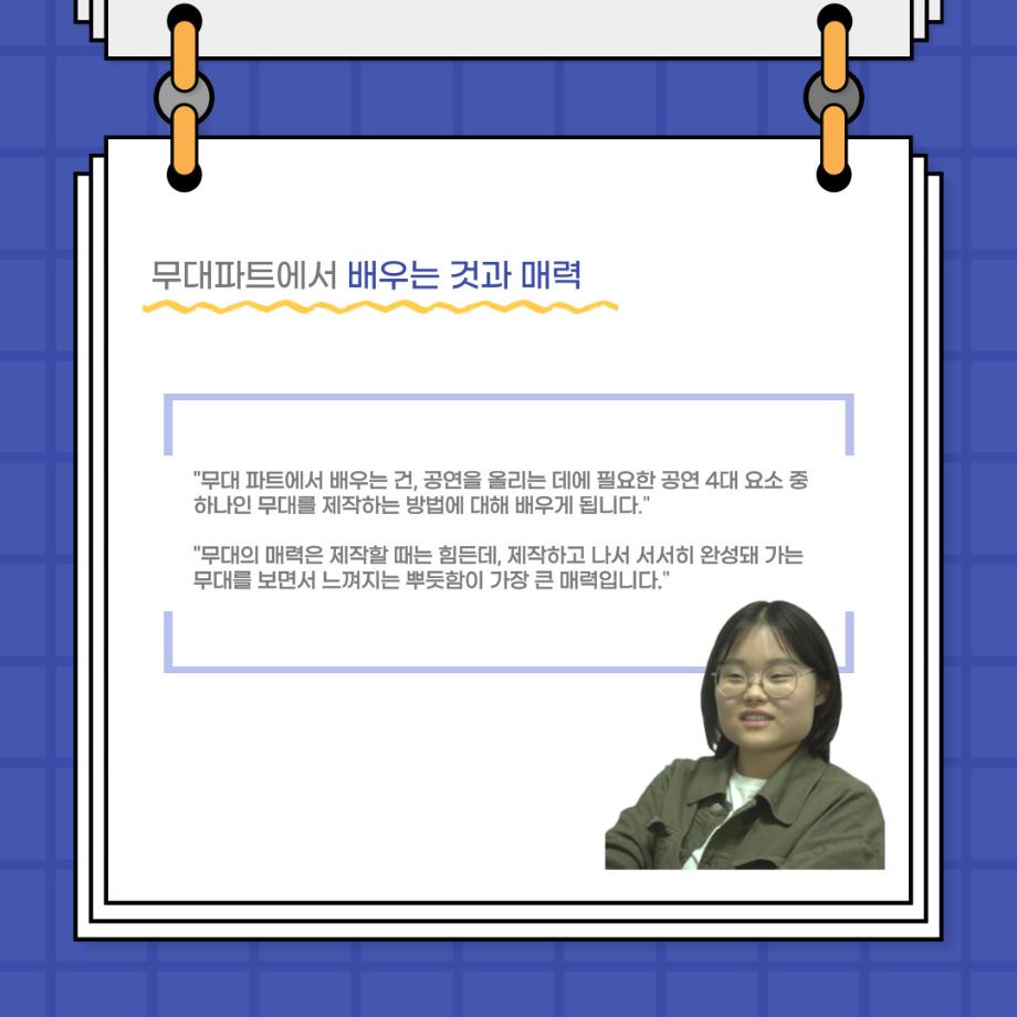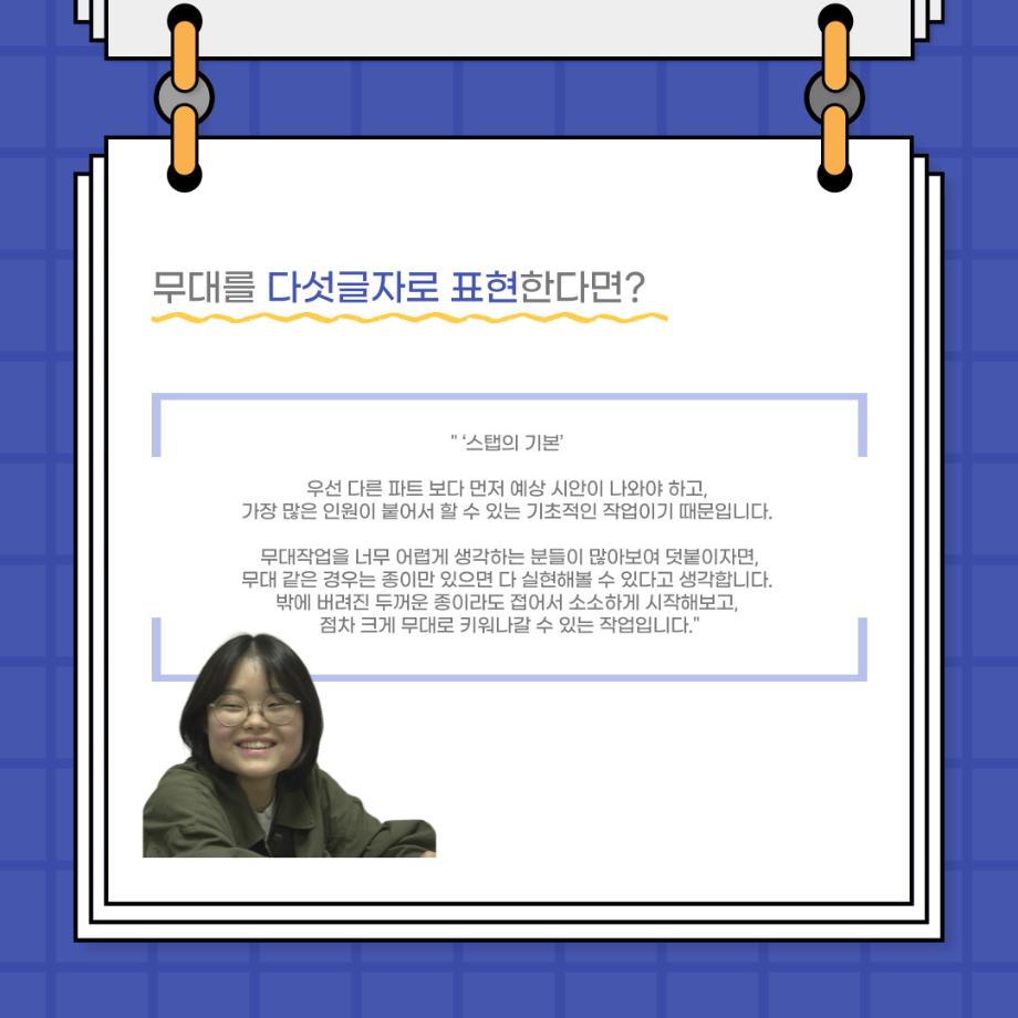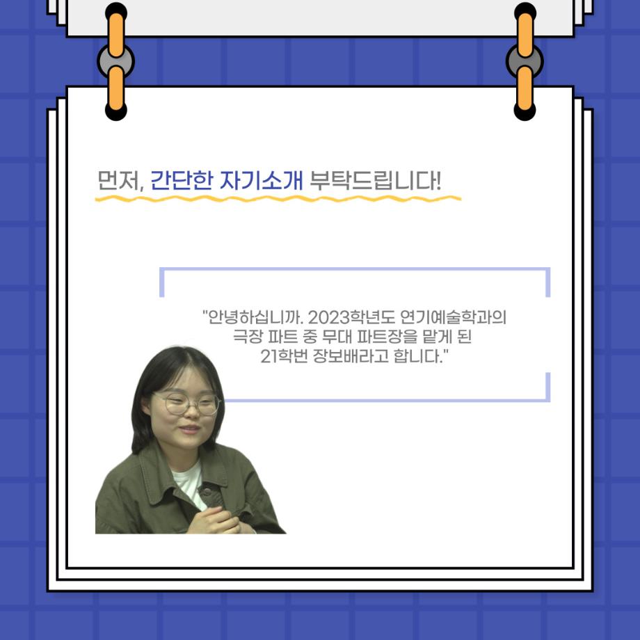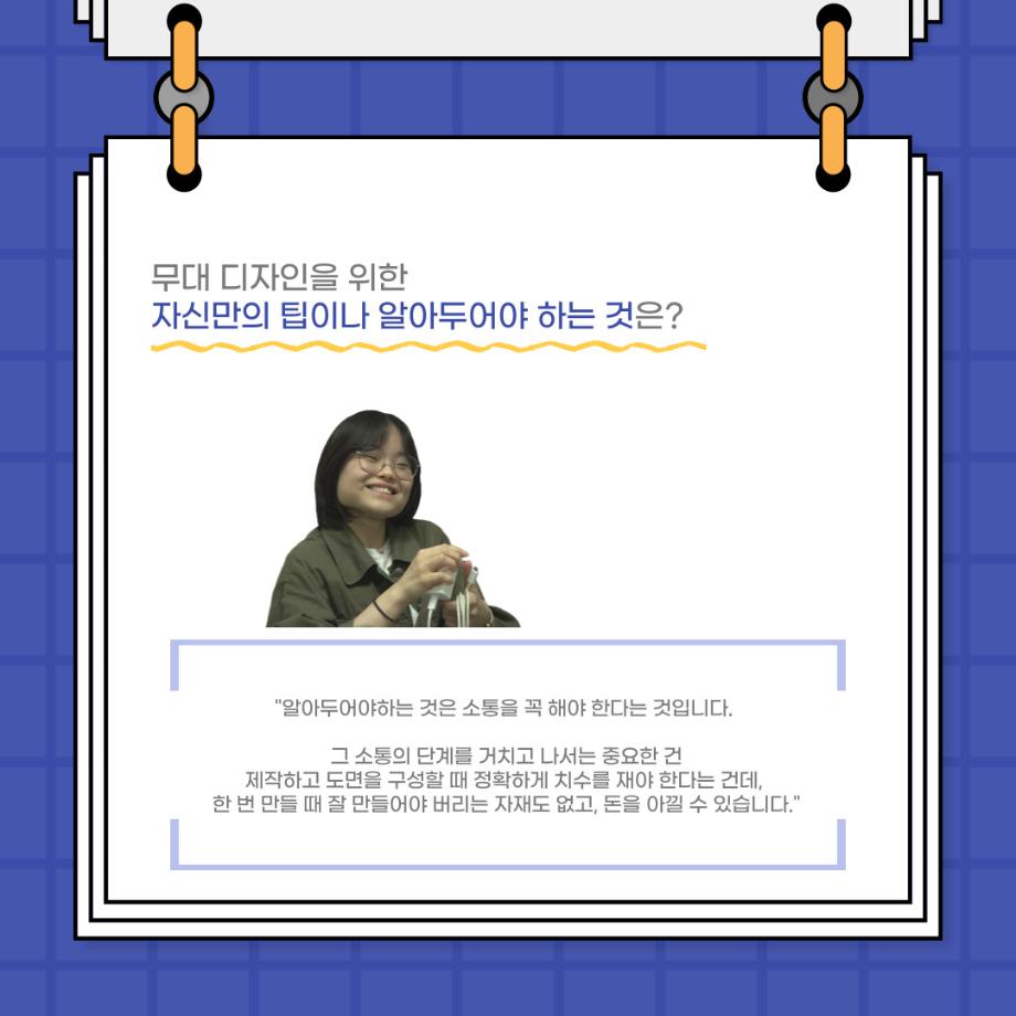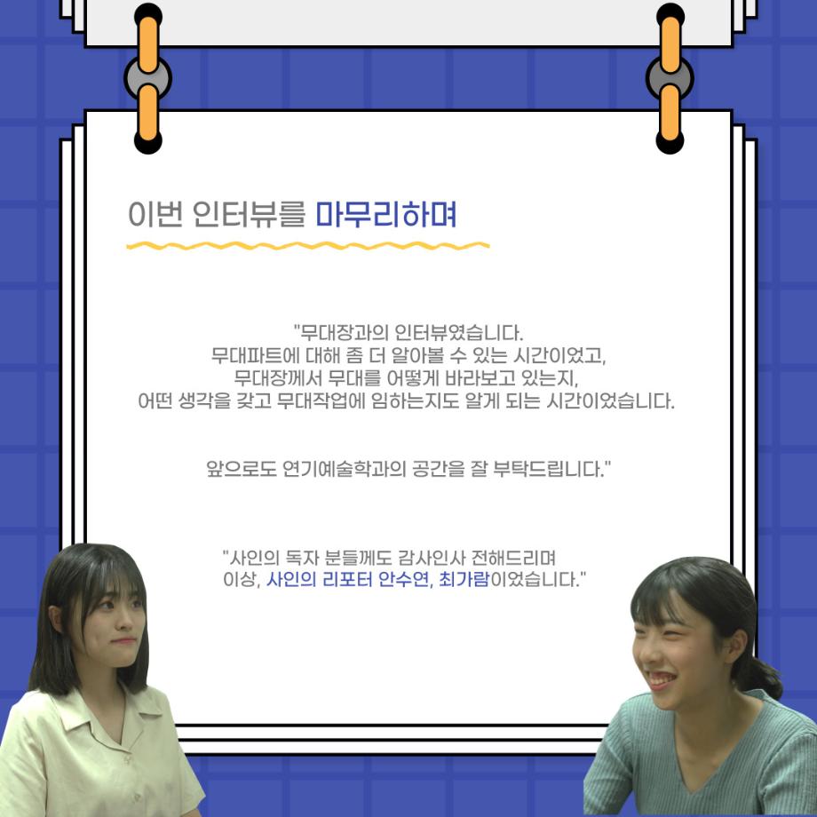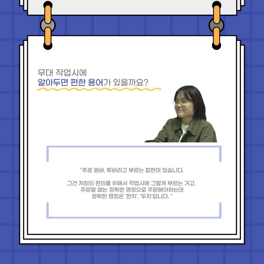 본문 시작 홈으로 커뮤니티 학과소개 입학정보 교수소개 학과과정 커뮤니티 공연예매 안내 홈페이지가이드 포토갤러리 공지사항 포토갤러리 작품DB 동아리 학사일정 학생회 포토갤러리 페이스북 트위터 프린트 사이와의 인터뷰 - 23년도 무대장 ‘장보배‘ 연기예술학과 3625 2023-08-21 안녕하십니까! 23년도 학회 ‘사이’입니다! 학회 ‘사이’의 일곱번째 인터뷰로 연기예술학과 23년도 무대장인 장보배 학생과 인터뷰하는 시간을 가졌습니다. 이번 인터뷰에서는 무대 파트의 매력과 무대 작업시 가장 중요한 것, 무대 작업에서 알아두어야 하는 것 등에 대해 인터뷰하였습니다. 다음 인터뷰 컨텐츠 ‘사인’도 많은 사랑 부탁드립니다. 목록 이전제 96회 세명대학교 연기예술학과 정기공연 하계 프로젝트 - < d0nut > 다음 제 97회 세명대학교 연기예술학과 정기공연 '하계 프로젝트' < 첼로와 케찹 > 담당부서 : 연기예술학과 담당자 : - 연락처 : 043-649-1733 최종수정일 : 2024-10-26 만족도조사 만족도 조사 이 페이지에서 제공하는 정보에 대하여 만족하시나요? 매우만족 만족 보통 불만족 매우불만족