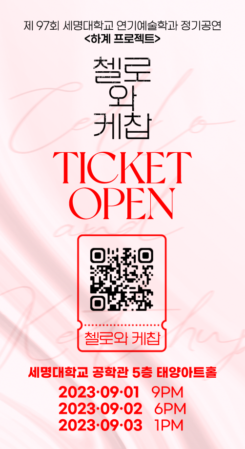 본문 시작 홈으로 커뮤니티 학과소개 입학정보 교수소개 학과과정 커뮤니티 공연예매 안내 홈페이지가이드 포토갤러리 공지사항 포토갤러리 작품DB 동아리 학사일정 학생회 포토갤러리 페이스북 트위터 프린트 제 97회 세명대학교 연기예술학과 정기공연 '하계 프로젝트' < 첼로와 케찹 > 연기예술학과 3814 2023-08-24 제 97회 세명대학교 연기예술학과 정기공연 '하계 프로젝트' < 첼로와 케찹 > 캐릭터 포스터 입니다. 𝑪𝒆𝒍𝒍𝒐 𝒂𝒏𝒅 𝑲𝒆𝒕𝒄𝒉𝒖𝒑 𝟐𝟎𝟐𝟑•𝟎𝟗•𝟎𝟏 𝟗𝐏𝐌 𝟐𝟎𝟐𝟑•𝟎𝟗•𝟎𝟐 𝟔𝐏𝐌 𝟐𝟎𝟐𝟑•𝟎𝟗•𝟎𝟑 𝟏𝐏𝐌 세명대학교 공학관 5층 태양아트홀 - 2023.08.19 - 2023.09.11 첫 번째 작품 | d0nut 두 번째 작품 | 첼로와 케찹 세 번째 작품 | 하녀들 여러분들의 많은 관심과 참여 부탁드립니다. 목록 이전사이와의 인터뷰 - 23년도 무대장 ‘장보배‘ 다음 제5회 세명진로 Festival 개최 안내 담당부서 : 연기예술학과 담당자 : - 연락처 : 043-649-1733 최종수정일 : 2024-10-26 만족도조사 만족도 조사 이 페이지에서 제공하는 정보에 대하여 만족하시나요? 매우만족 만족 보통 불만족 매우불만족