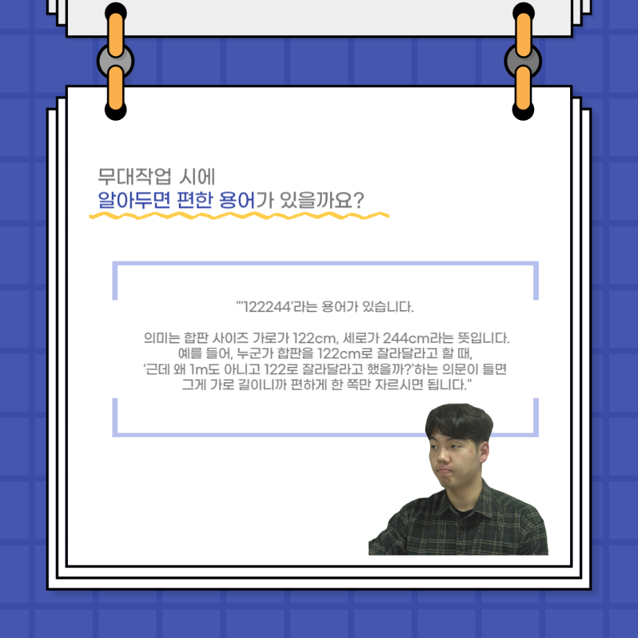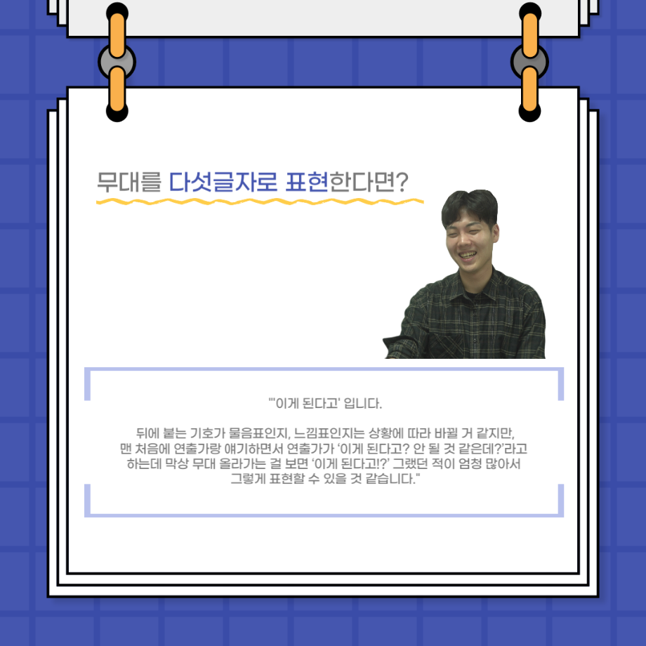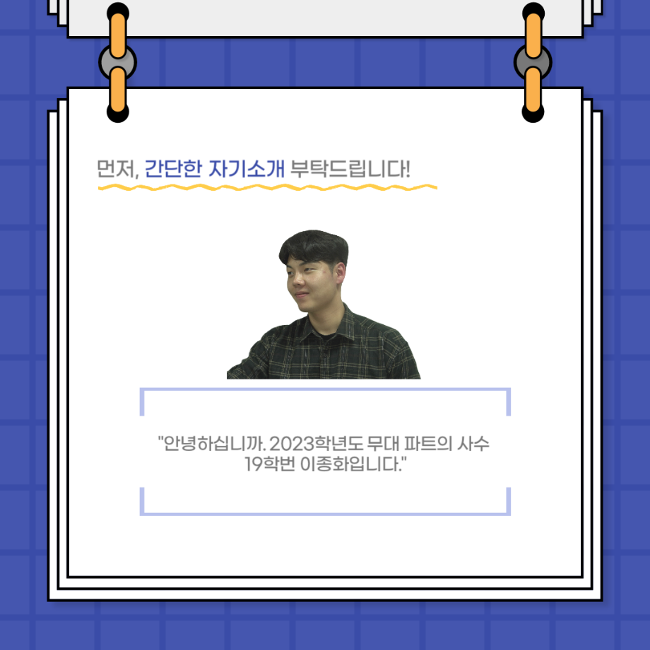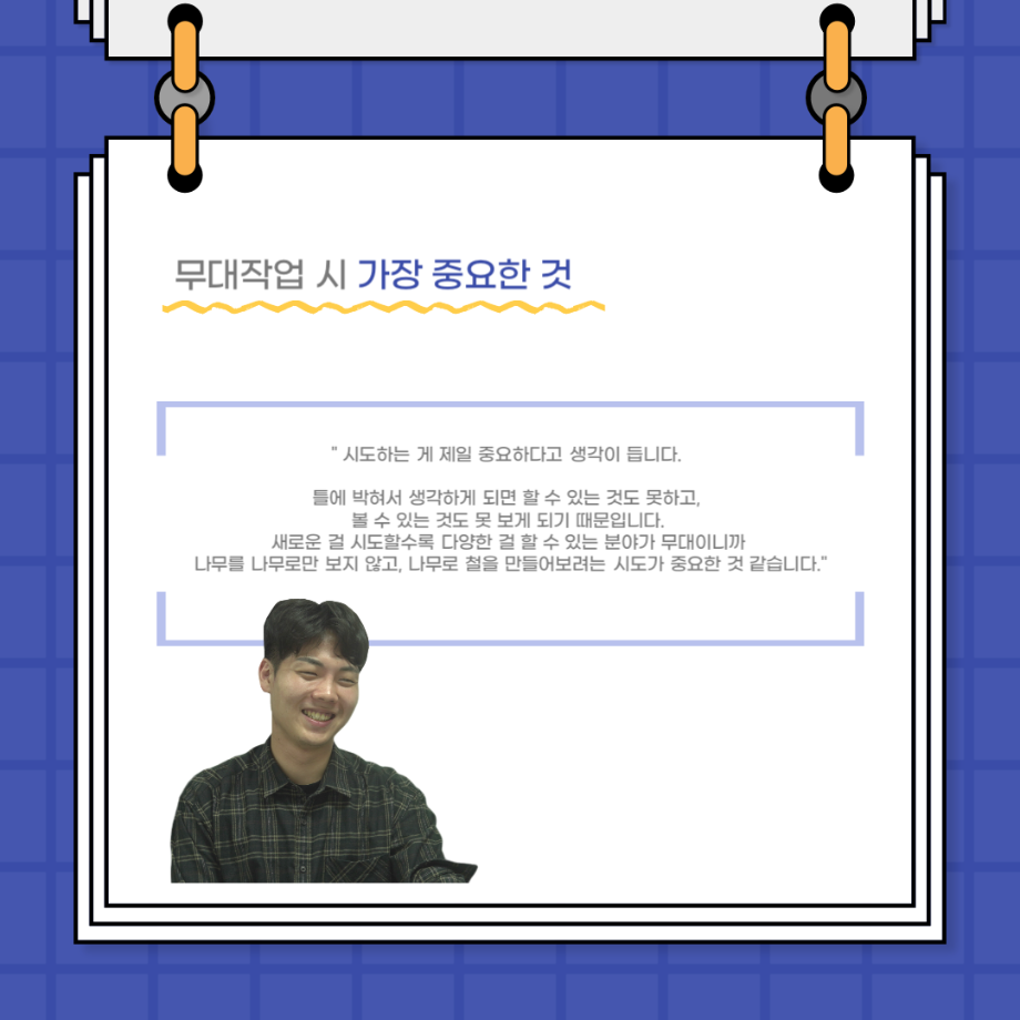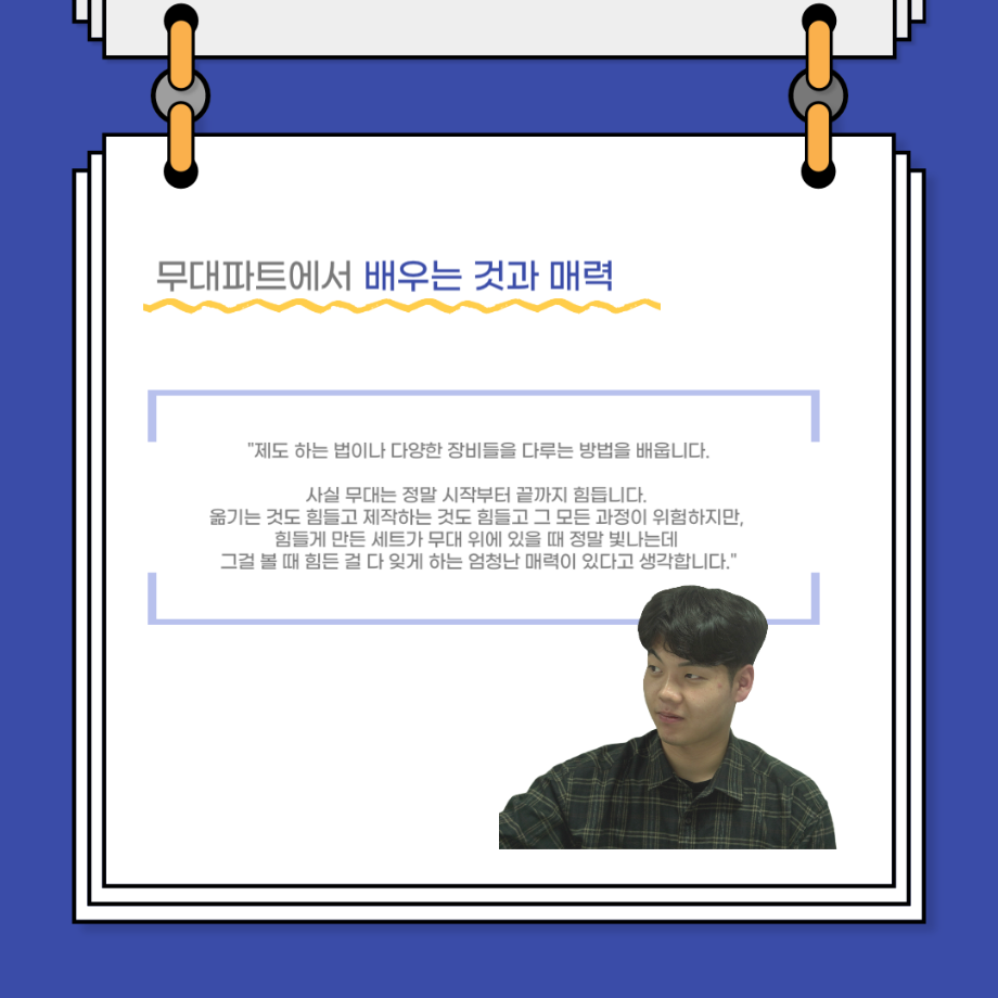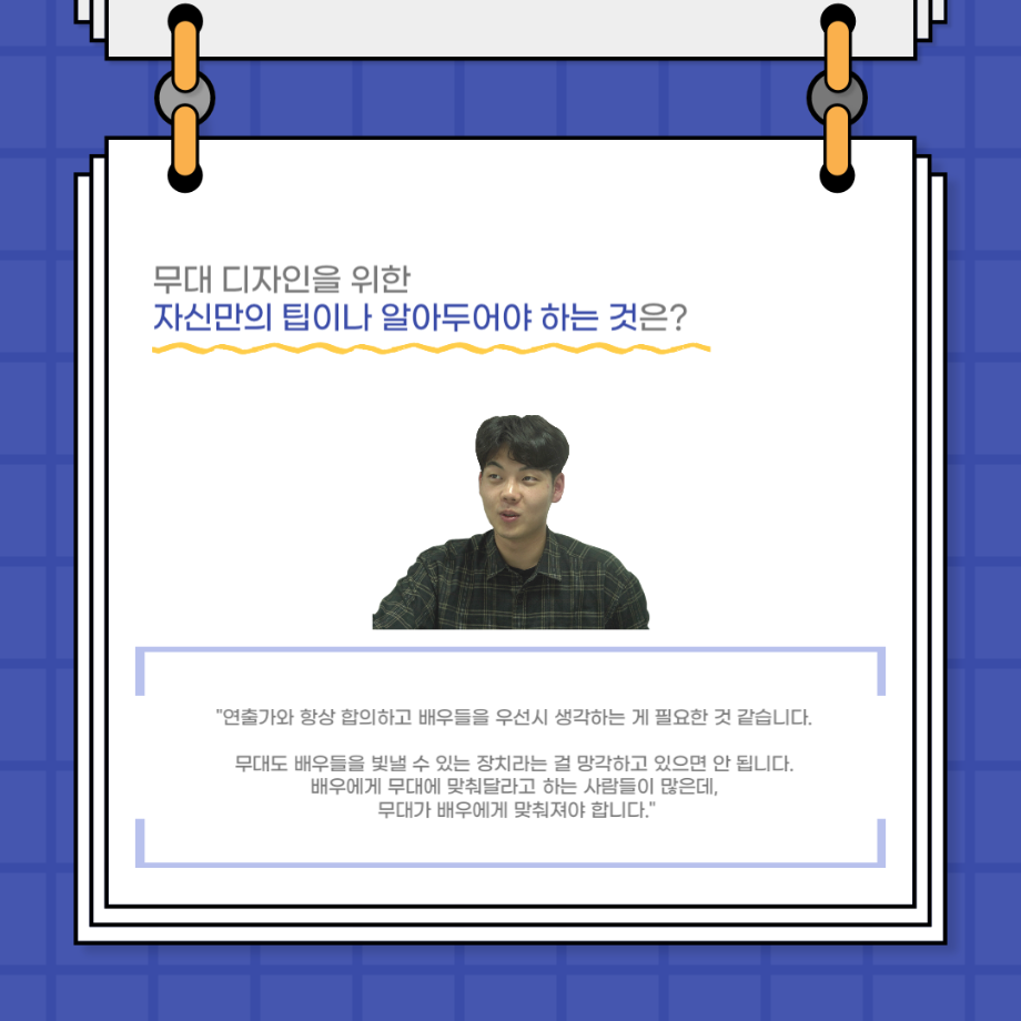 본문 시작 홈으로 커뮤니티 학과소개 입학정보 교수소개 학과과정 커뮤니티 공연예매 안내 홈페이지가이드 포토갤러리 공지사항 포토갤러리 작품DB 동아리 학사일정 학생회 포토갤러리 페이스북 트위터 프린트 사이와의 인터뷰 - 23년도 무대사수 ‘이종화’ 연기예술학과 3705 2023-08-31 안녕하십니까. 23년도 학회 ‘사이’입니다! 학회 ‘사이’의 여덟번째 인터뷰로 연기예술학과 23년도 무대사수인 이종화 학생과 인터뷰하는 시간을 가졌습니다. 이번 인터뷰에서는 무대 파트의 매력과 무대 작업시 가장 중요한 것, 무대 작업에서 알아두어야 하는 것 등에 대해 인터뷰하였습니다. 다음 인터뷰 컨텐츠 ‘사인’도 많은 사랑 부탁드립니다. 목록 이전사이와의 인터뷰 - 23년도 부학회장 ‘심명균’ 다음 ★제5회 세명진로Festival 자기소개서 특강 모집안내★ 담당부서 : 연기예술학과 담당자 : - 연락처 : 043-649-1733 최종수정일 : 2024-10-26 만족도조사 만족도 조사 이 페이지에서 제공하는 정보에 대하여 만족하시나요? 매우만족 만족 보통 불만족 매우불만족