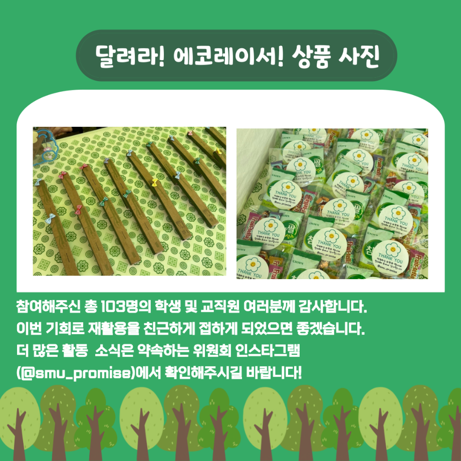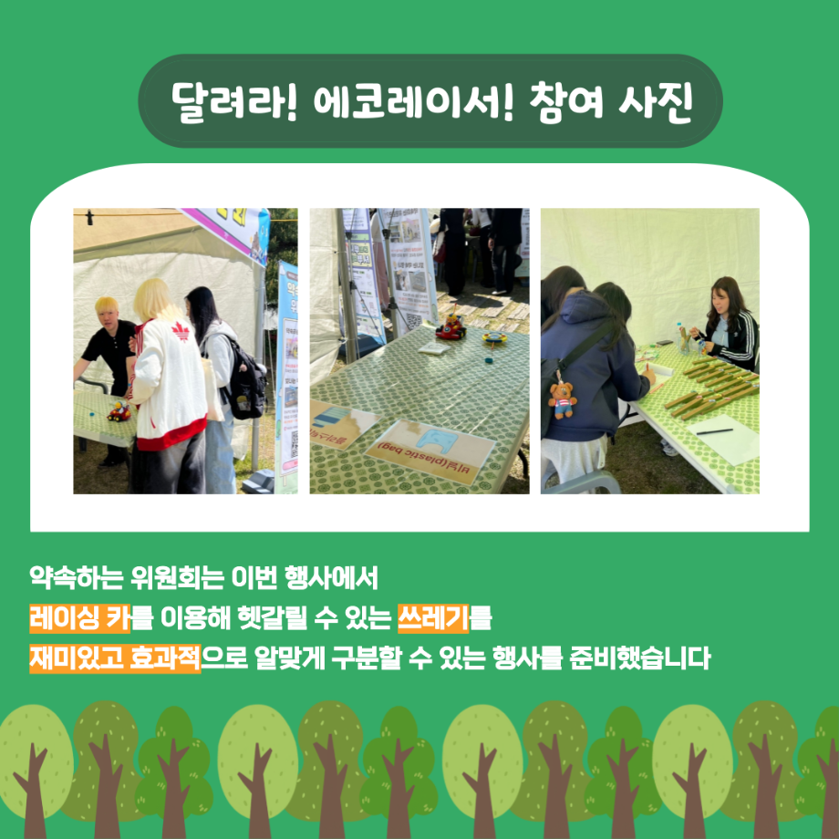 본문 시작 홈으로 포토갤러리 학생위원회 개요 학생위원회 소개 공지사항 활동결과 홈페이지가이드 포토갤러리 페이스북 트위터 프린트 [약속하는 위원회] 달려라 에코레이서 학술정보원 1064 2025-05-15 안녕하세요 재미있는 경험을 위한 학생위원회 '약속하는 위원회' 입니다! 약속하는 위원회 행사인 달려라! 에코레이서! 활동이 성황리에 마무리 되었습니다 :) [달려라! 에코레이서! 행사 결과] 일시 : 2025년 5월 14일(수) 10:00 ~ 13:30 장소 : 뭐든지 광장 행사 참여자 : 103명 달려라! 에코레이서! 행사에 참여해주신 모든 분들께 진심으로 감사 드립니다! 추후에 이어질 약속하는 위원회 활동도 많은 관심 바랍니다! 목록 이전[꽃피는 위원회] 제4회 벚꽃축제 '벚꽃세봄' 다음 [꽃피는 위원회] 제 4회 사랑의 꽃집사 체험이벤트 담당부서 : 장학복지팀 담당자 : - 연락처 : 043-649-1142 최종수정일 : 2024-10-26 만족도조사 만족도 조사 이 페이지에서 제공하는 정보에 대하여 만족하시나요? 매우만족 만족 보통 불만족 매우불만족
