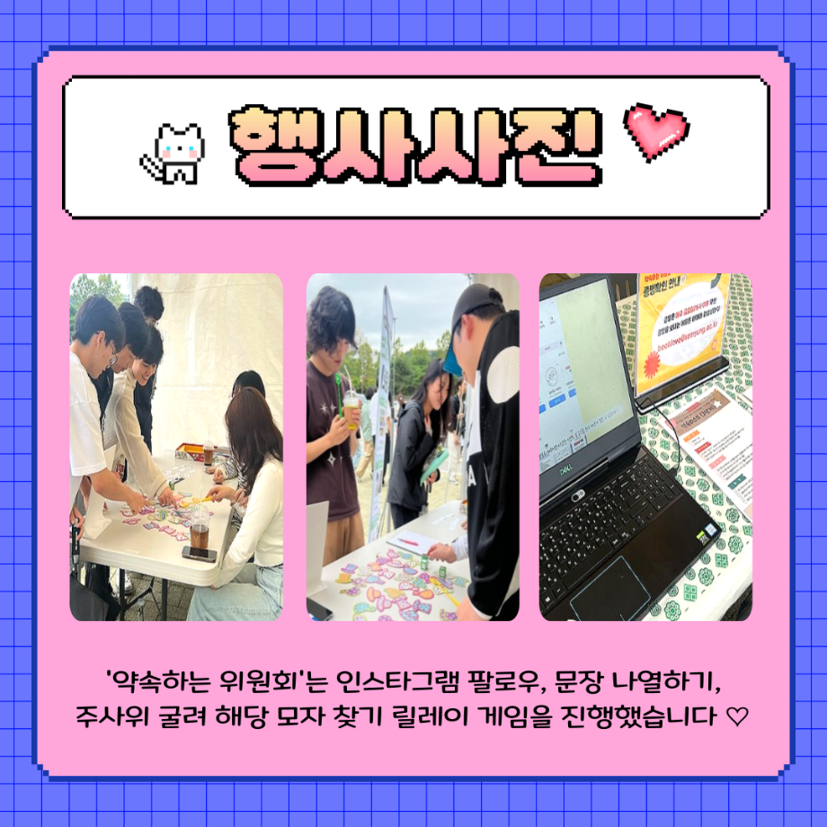 본문 시작 홈으로 포토갤러리 학생위원회 개요 학생위원회 소개 공지사항 활동결과 홈페이지가이드 포토갤러리 페이스북 트위터 프린트 [약속하는 위원회] 뽕뽕오락실 학술정보원 696 2025-09-24 안녕하세요 재미있는 경험을 위한 학생위원회 '약속하는 위원회' 입니다! 약속하는 위원회 행사인 뿅뿅! 약속오락실! 활동이 성황리에 마무리 되었습니다 :) [뿅뿅! 약속오락실! 행사 결과] 일시 : 2025년 9월 24일(수) 14시~17시 장소 : 학생회관 앞 광장 행사 참여자 : 103명 뿅뿅! 약속오락실! 행사에 참여해주신 모든 분들께 진심으로 감사드립니다! 추후에 이어질 약속하는 위원회 활동도 많은 관심 바랍니다! 목록 이전[생각하는 위원회] 손으로 빚는 빛 다음 [꽃피는 위원회] 꽃 돌려라 피어라 담당부서 : 장학복지팀 담당자 : - 연락처 : 043-649-1142 최종수정일 : 2024-10-26 만족도조사 만족도 조사 이 페이지에서 제공하는 정보에 대하여 만족하시나요? 매우만족 만족 보통 불만족 매우불만족